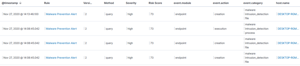 Finally, we need to enable detection rules for our EndPoint agent. Go to the detections dashboard in the Kibana Security app, and “enable” any endpoint rules you want.