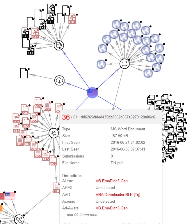 When searching on the Microsft IP addresses, none of them returns any “detection” hits. However, if we look in the “relations” tabs and look at communicating files, we can see many hits on malicious word documents that have called out to some of the IPs we’ve seen. If we draw a threat graph, like the one below, we can see an example of a malicious document that has been associated with the Microsoft IP 52.114.132.91.